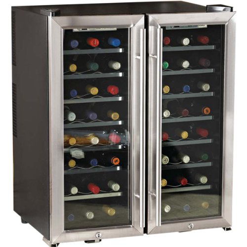 Store reds and whites separately or together Protects the taste of reds and whites with virtually silent cooling technology in 2 separate 24-bottle compartments (details below). Offers classic complementary styling for the home with double stainless steel-trim doors. Makes adjusting temperature easy with push-button controls inside. All for a price that makes enjoying wine affordable! A thermoelectric energy-efficient CFC-free wine cooler. ETL approved. 48-bottle capacity* Left zone adjustable temperature range: 50-64°F Right zone adjustable temperature range: 54-64°F Interior push-button control with temperature display 2 Thermopane glass doors with stainless steel trim pull handles and locks 14 pull-out chrome shelves with stainless steel trim Interior LED lighting Freestanding only** Size: 33-1/4'H w/hinge x 27-1/2'W x 22-1/2'D w/handles *Note: Shelving is meant to hold standard Bordeaux size bottles using larger size bottles may limit the capacity. If you would like to store larger bottles you can easily remove any of the shelves. This will also prevent scraping the labels on the larger bottles. Applications: This model is not meant to be built-in to cabinetry recessed or put underneath a counter. Additionally this model is not meant to be used in an enclosed area. While the back of the unit does produce a minimal amount of heat it still needs to vent to an open area.